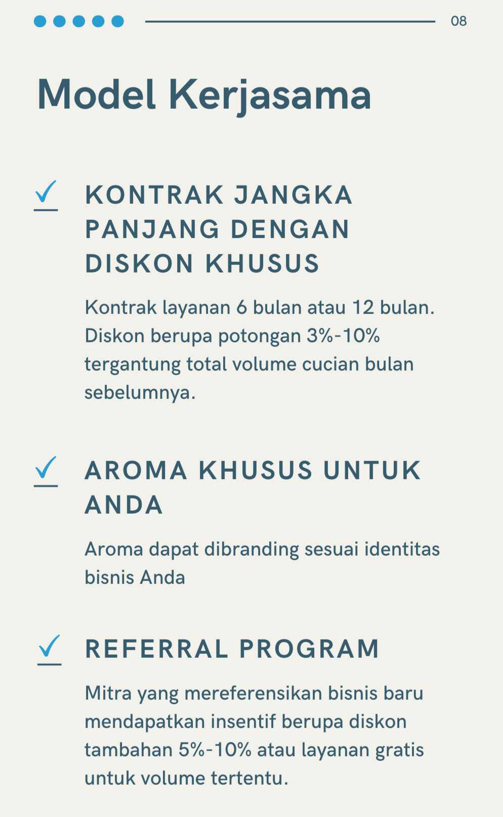 Gunakan layanan kami dan rasakan pengalaman mencuci yang tidak hanya cepat dan efisien, tapi juga penuh kepedulian dan kehangatan keluarga.Tak hanya pakaian, kami juga melayani pembersihan helm dan sepatu dengan formulasi aman bagi lingkungan, proses cepat, dan harga terjangkau.Kami membuka peluang kemitraan dengan berbagai jenis usaha. Hingga saat ini, lebih dari 10 klinik, kafe, dan salon di Jakarta telah mempercayakan kebutuhan laundry mereka kepada kami. Yuk gabung!